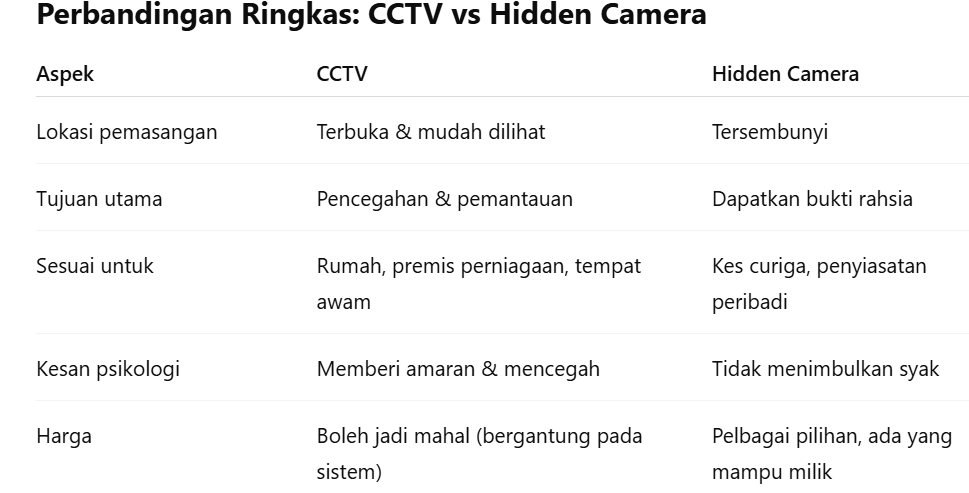 Jika anda mahu pantau dan cegah – CCTV adalah pilihan terbaik. Jika anda mahu buktikan sesuatu yang disyaki secara diam-diam – hidden camera adalah jawapannya. Kedua-duanya ada peranan penting dalam aspek keselamatan dan privasi. Yang penting, pastikan anda guna dengan niat yang betul dan tidak melanggar undang-undang.